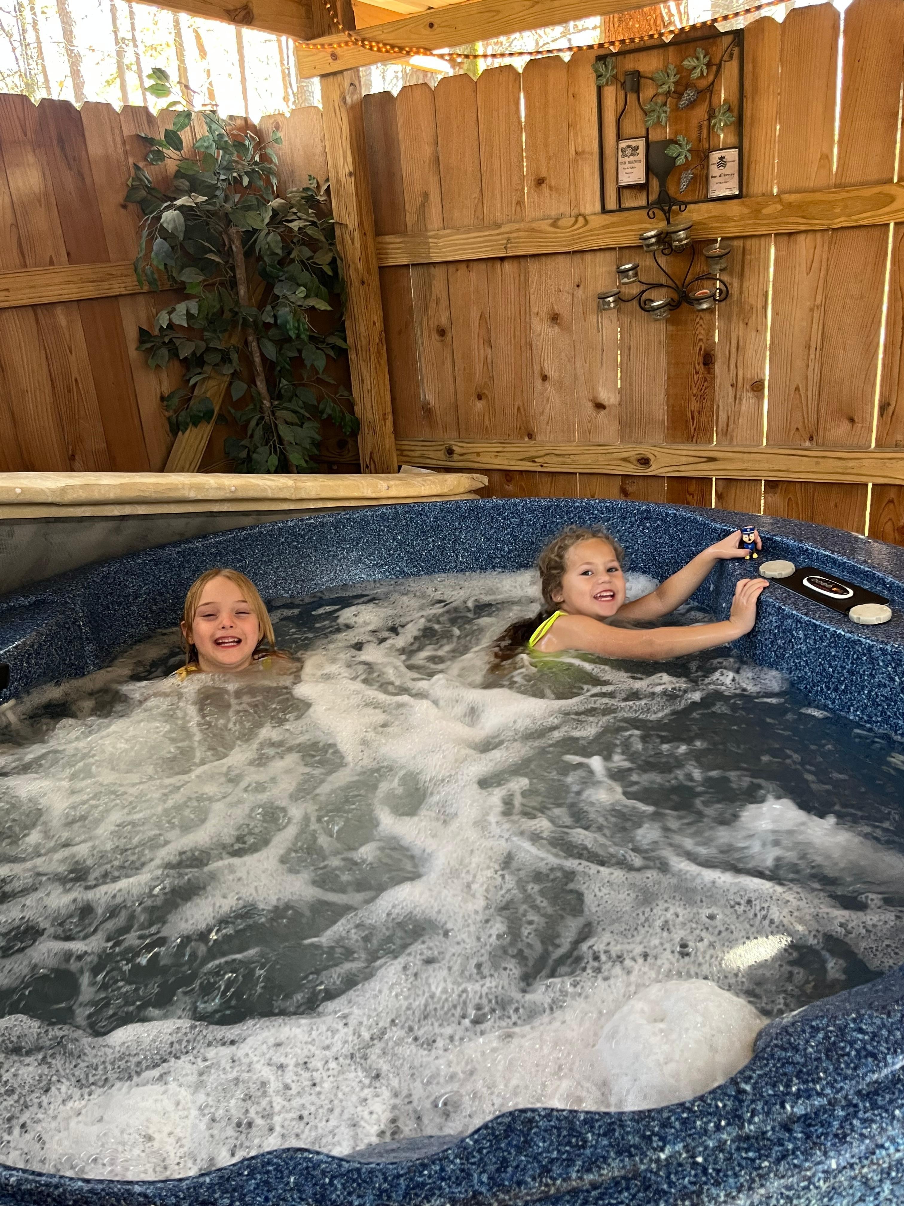 Versammeln Sie sich um die Feuerstelle und rösten Sie Marshmallows, bevor Sie in Ihren Badeanzug wechseln und ein langes Bad im Whirlpool nehmen. Der Whirlpool befindet sich in einer teilweise geschlossenen Struktur, die einen privaten Rückzugsort für bis zu 5 Personen bietet.