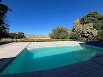 Schiebetüren führen Sie in den überdachten Außenbereich mit großen Außentischen und Stühlen, Sonnenliegen und Grill. Dieser Bereich überblickt den vollständig eingezäunten Pool unter der Erde. Dieses Haus ist der perfekte Ort für Familien, um ihren Urlaub zu genießen.