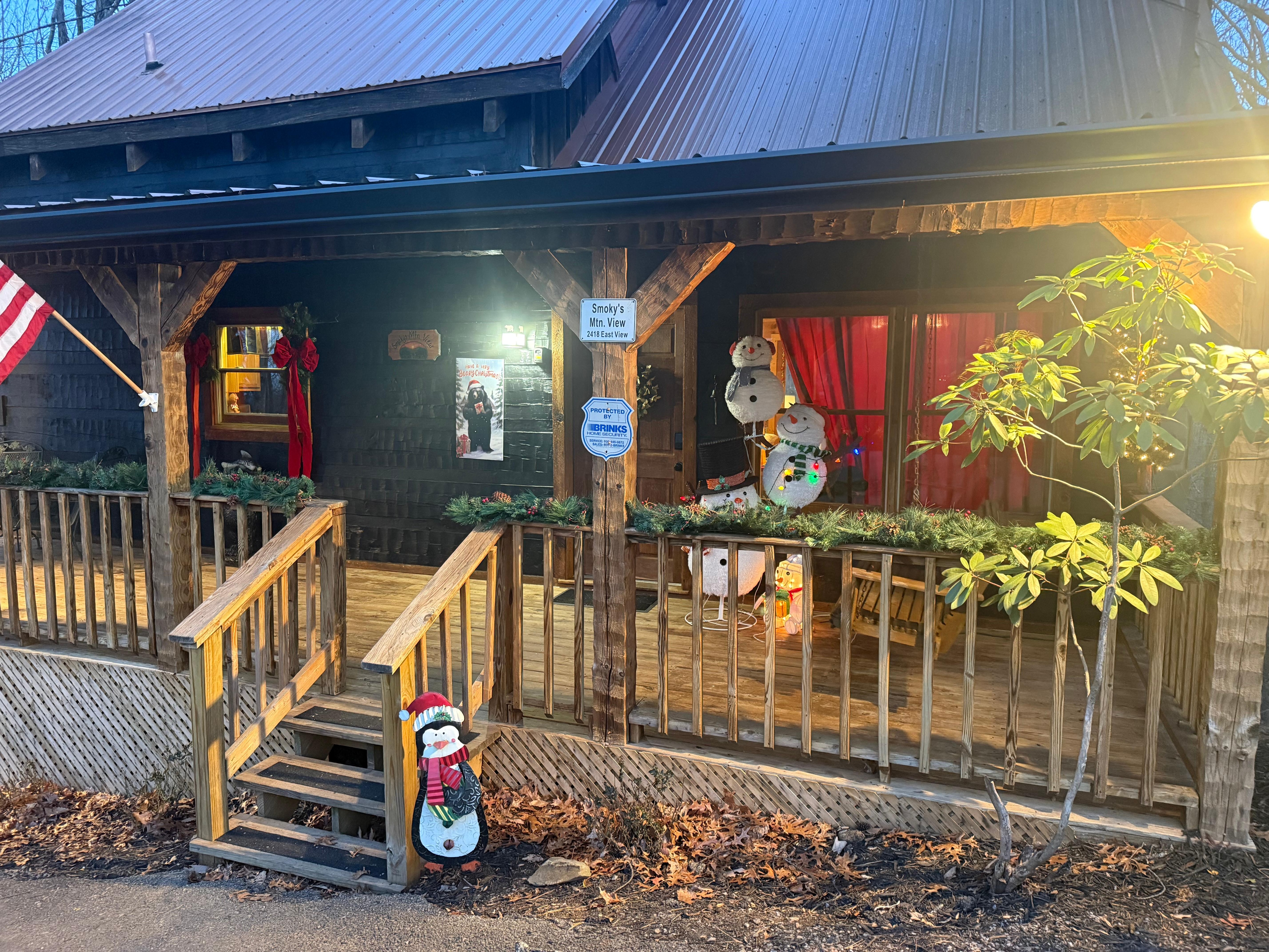 Die Kabine hat eine überdachte Veranda auf der Vorderseite und auf der Rückseite. Die Veranda hat die 5 Personen Whirlpool mit Blick auf den schönen Bergblick. Es gibt bequeme Schaukelstühle, um die Aussicht zu genießen, zusammen mit einem Tisch im Freien und es gibt einen Holzkohlegrill im Park-Stil. Die Seiten Deck hat einen Wurf Spiel Mais Loch. Es gibt auch Brett- und Kartenspiele für Stunden der Familie Zweisamkeit.