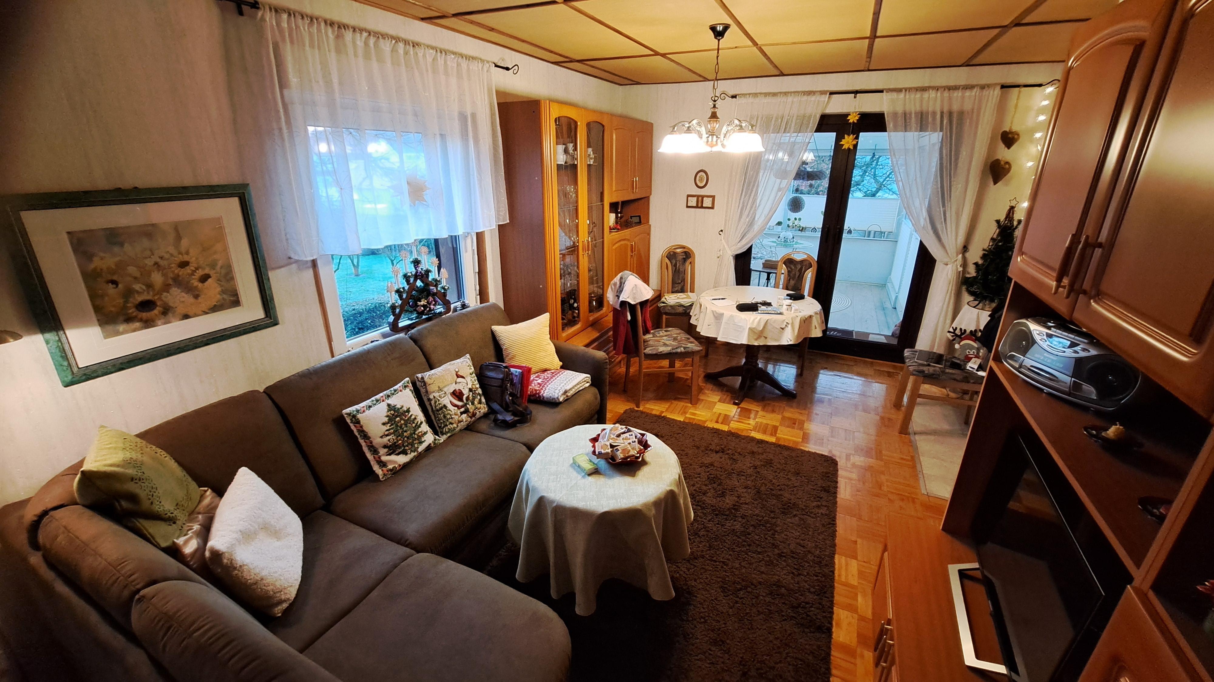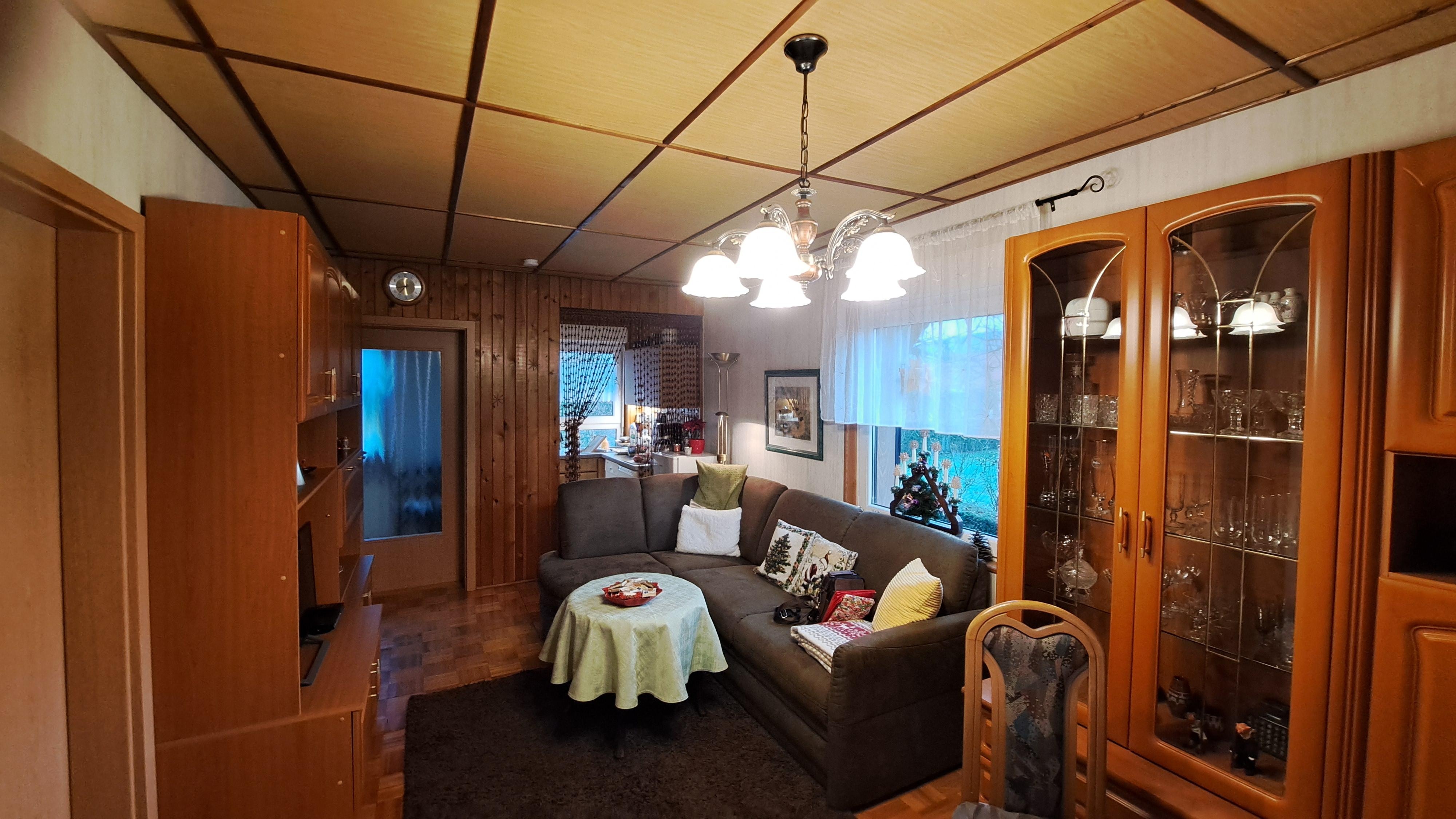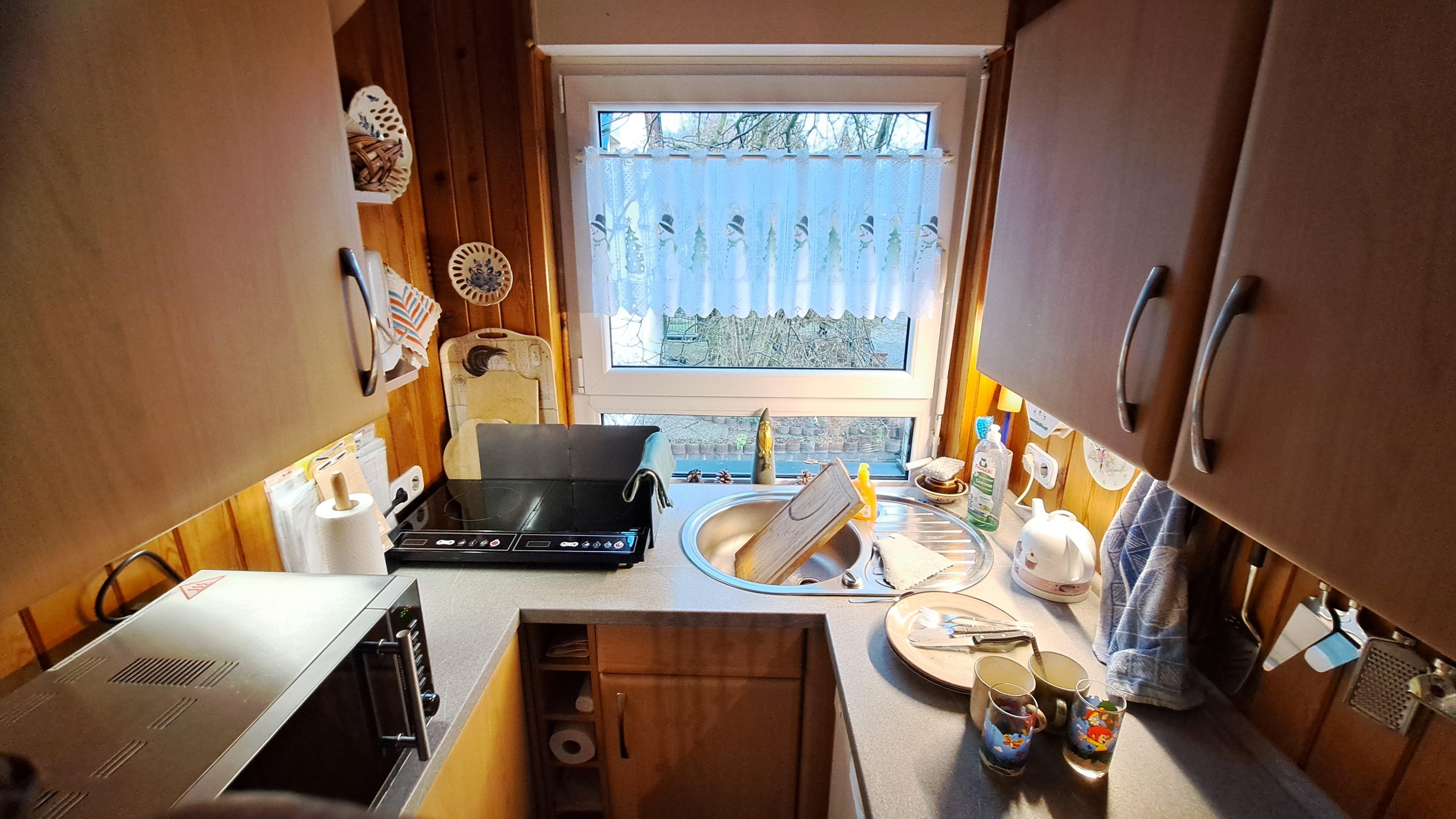 Wer gern kocht oder einen Snack zubereitet, findet eine passabel ausgestattete Küche mit 2 Kochplatten, Mikrowelle, Geschirrspüler bis zur Kaffeemaschine einschließlich Gewürzen alles vor, was er braucht, um dann im Essbereich des Wohnzimmers, im Wintergarten oder auf der Hochterrasse zu servieren. Wer gern grillt und an der frischen Luft sitzt, kann seine Leckerbissen auf der Hochterrasse auf einem E-Standgrill zubereiten und dabei die Aussicht über den Garten auf Berge genießen.