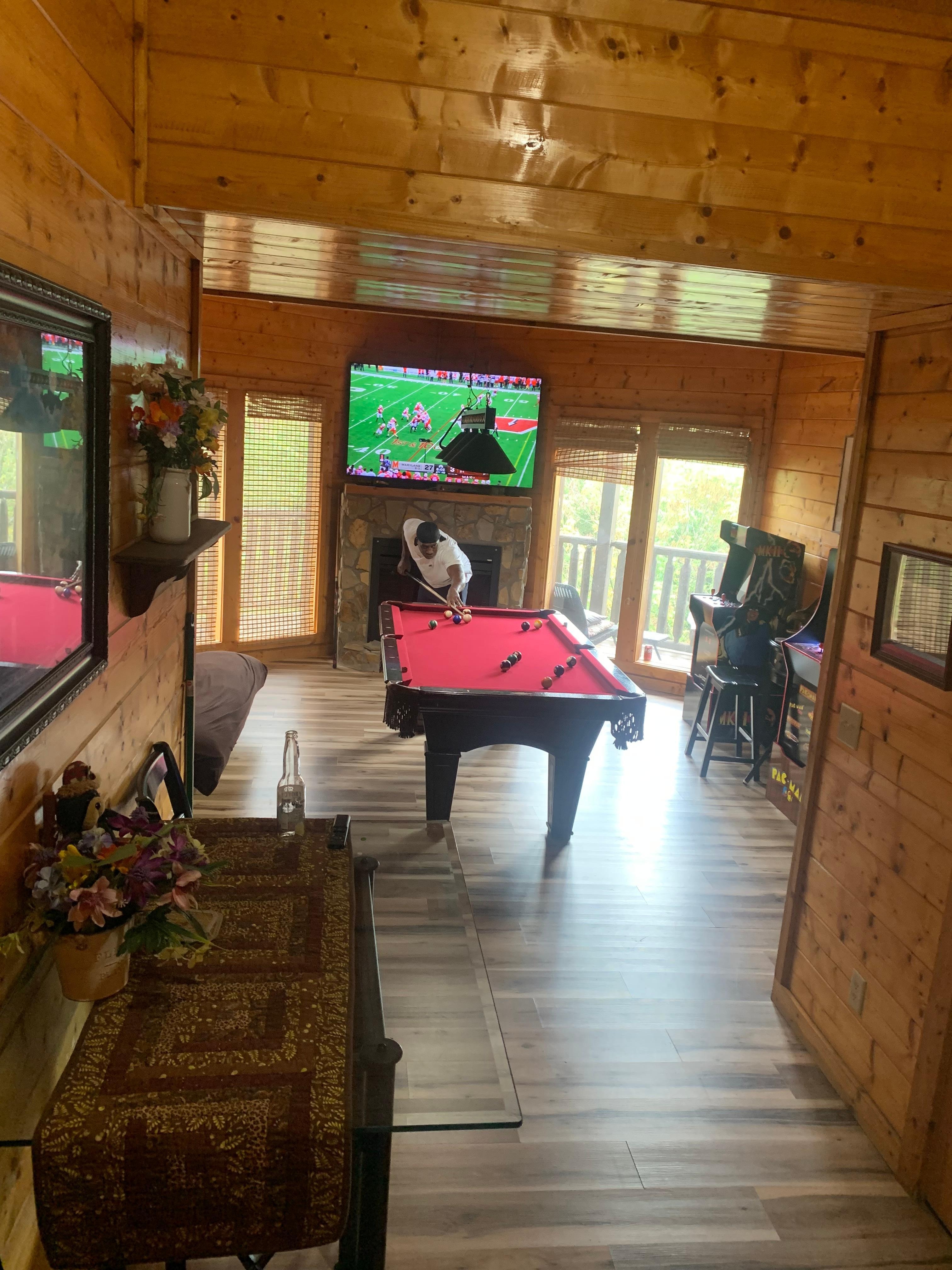 Entspannen Sie sich nach einem langen Tag in dieser Kabine des Wanderns, die 2 Kamine verfügt! Ein Highspeed-Internetzugang und Kabel-Programmierung ist auch für Ihre Unterhaltung zur Verfügung. In jedem Schlafzimmer befindet sich ein Bluetooth-Lautsprecher, sodass Sie Ihre eigenen Musikstücke ungestört genießen können. Es gibt auch Bluetooth-Lautsprecher in den Wohn- und Spielzimmern. Es gibt 7 Fernseher in der Kabine, darunter einen in jedem Schlafzimmer. Bei voller Transparenz sind einige der Fernseher veraltet und wir hoffen, sie so bald wie möglich auf Smart-TVs umstellen zu können. Die Fernseher im Wohnzimmer und im Spielzimmer sind an die DVD-Player angeschlossen. Sie können Netflix auch (mit Ihrem eigenen Konto) über den Fernseher im Wohnzimmer ansehen. Alle Fernseher haben Kabel.
