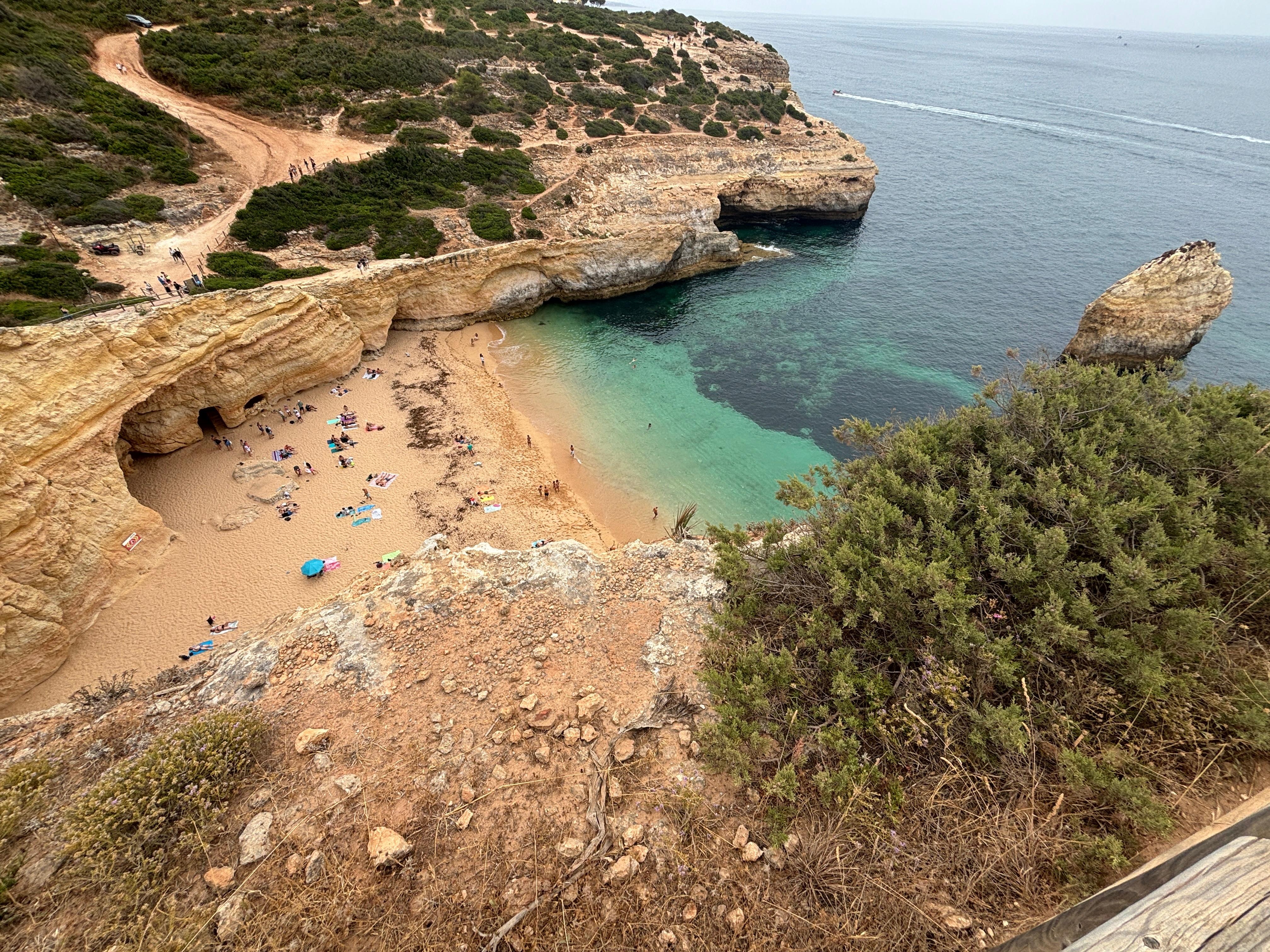 Nach einem Steinwurf erreichen Sie den idyllischen Strand Praia do Carvalho mit atemberaubenden Ausblicken und wunderschönen Felsstrukturen.