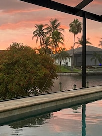 Water views on three sides, South west exposure, Large half acre lot with 207 ft of shoreline on intersecting canals, very private lanai area, new 3000 sq ft under air home, 2 garage spaces reserved for guests, all the comforts of home plus, built with "aging in place" in mind, two docks that don't block your view, large 2100 sq ft lanai and screened area, high end comfortable furniture, large kitchen with island, games room with pool table, quiet, safe area in extreme south west corner of Cape Coral near the mangroves on the Spreader Canal, whole house water treatment to remove chlorine plus a reverse osmosis system in kitchen, fairly quick access to Gulf of Mexico by boat, close to waterfront restaurants and marinas. We have two new bikes, a canoe and a fishing pole as well as underwater fish lights. The master bedroom has a few extra features to enhance romantic evenings.