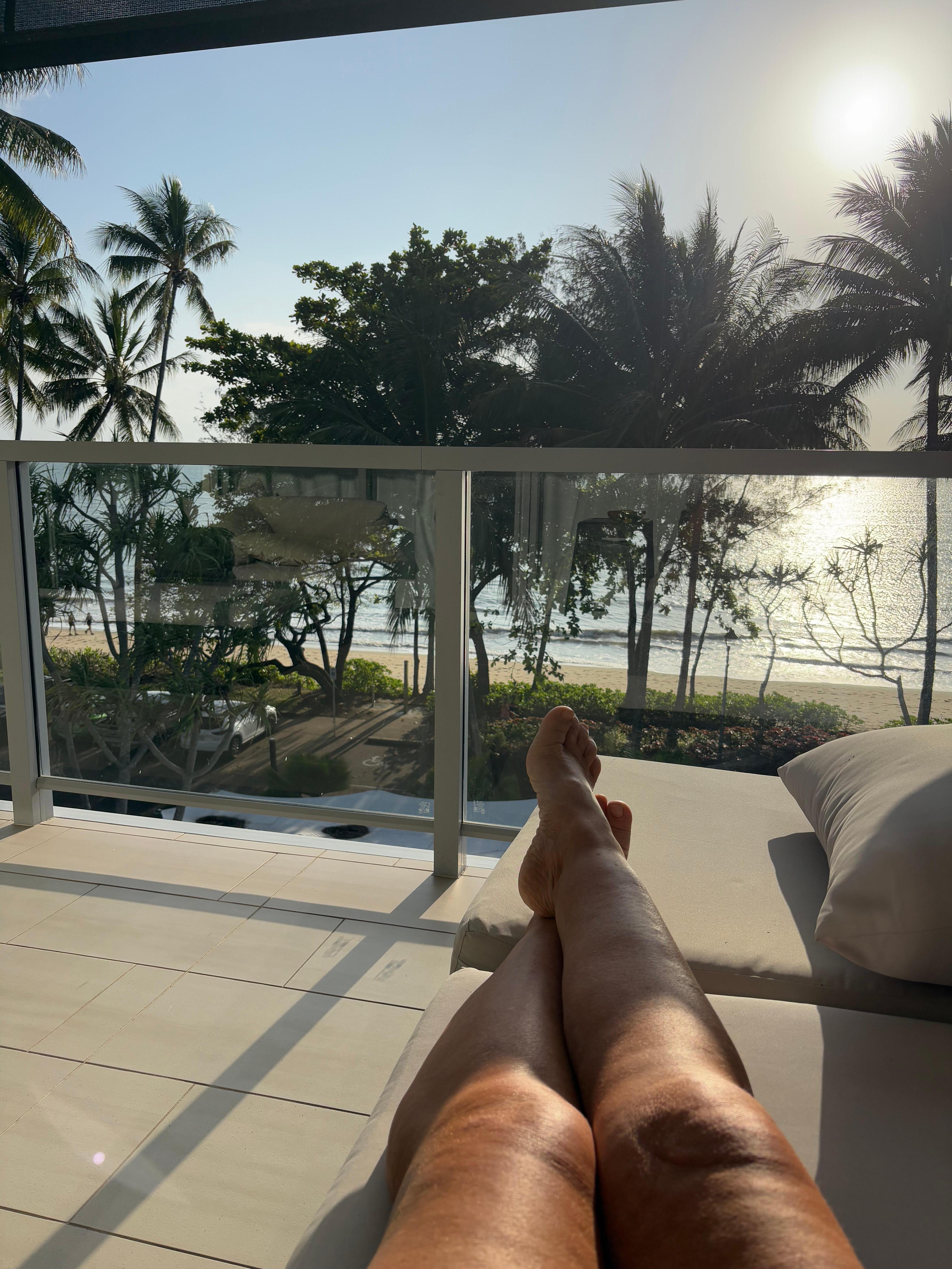 Durchgehende Glasschiebetüren führen zu einem weitläufigen, unterhaltsamen Balkon mit Blick auf Palm Cove Beach. Lassen Sie die Sonnenschirme herunter, um absolute Privatsphäre zu gewährleisten.