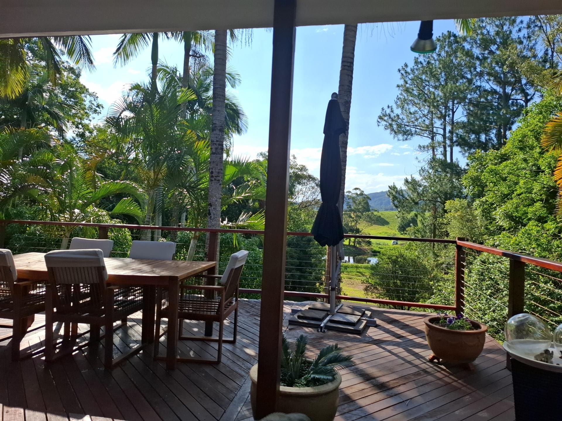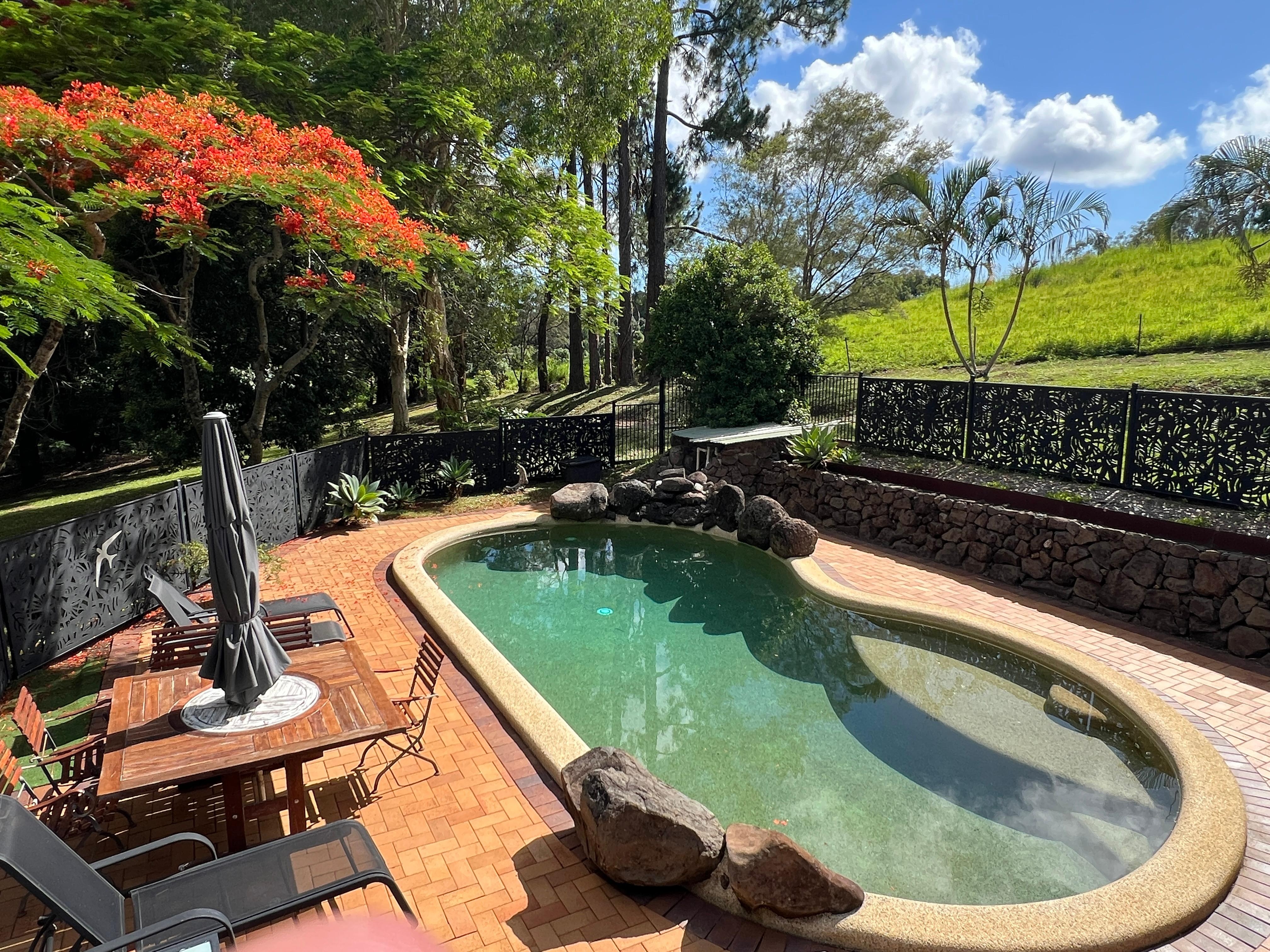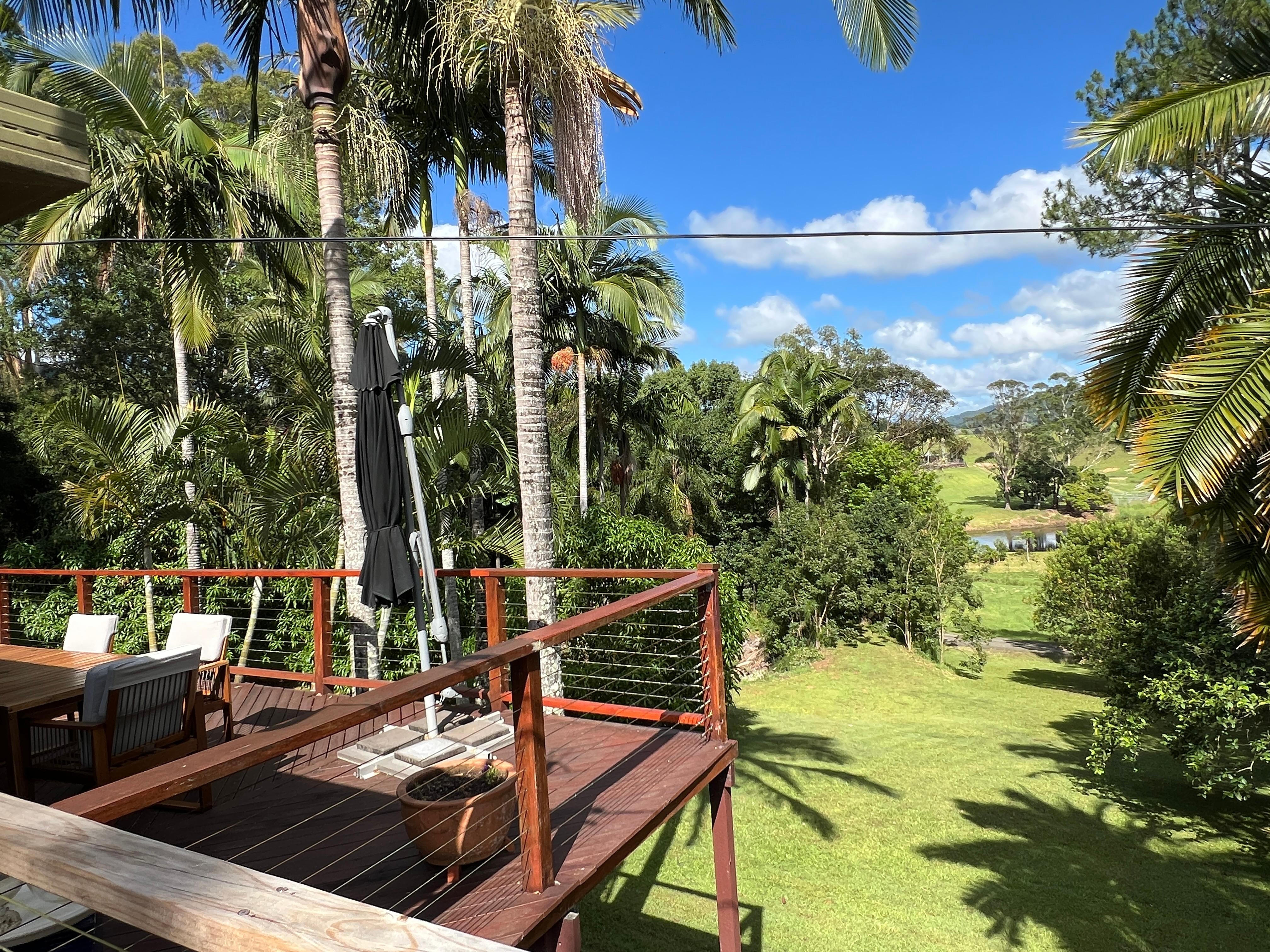 Viele Morgen gepflegter Rasenflächen mit Pool und offenem Haus mit großen erhöhten Veranden, von denen aus Sie die weiten, wunderschönen Sonnenuntergänge an der Nordküste und die herrliche Aussicht auf die Landschaft genießen können. Kaminfeuer und natürlich Holz für den Winter vorgesehen. Zwei Schlafzimmer mit Klimaanlage, eines mit einem Queensize-Bett und das andere mit einem Kingsize-Bett. Neu renoviertes Badezimmer mit großer Badewanne und Dusche sowie separatem WC-Raum. Sehr privates und friedliches Zuhause mit Ausnahme der seltsamen Kuhmuschel !! Das Haus befindet sich im Besitz eines Küchenchefs, sodass die Küche und der offene Essbereich für sich selbst sprechen und sich dann auf die riesigen Veranden und den Grillbereich über dem nach Norden ausgerichteten Pool öffnen. Byron Bay ist eine 17-minütige Fahrt und Brunswick Heads nur 10 Minuten entfernt, wo es sicheres Schwimmen und Strand gibt und auch viele Restaurants und Cafés. 10 Minuten zum Championship-Golfplatz Ocean Shores. Nur wenige Autominuten zum schönen hundefreundlichen Strand. NUR 10 MINUTEN FAHRT ZUM BLUES FESTIVAL UND 3 MINUTEN ZUM BUS-ABHOLPUNKT