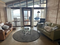 Das offene Wohnzimmer erstreckt sich auf eine private Terrasse, von der aus Sie einen uneingeschrĂ€nkten 180-Grad-Blick auf die Streaky Bay genieĂen können, die fĂŒr ihre atemberaubende und unberĂŒhrte KĂŒste an den Westkosten der Eyre-Halbinsel bekannt ist.