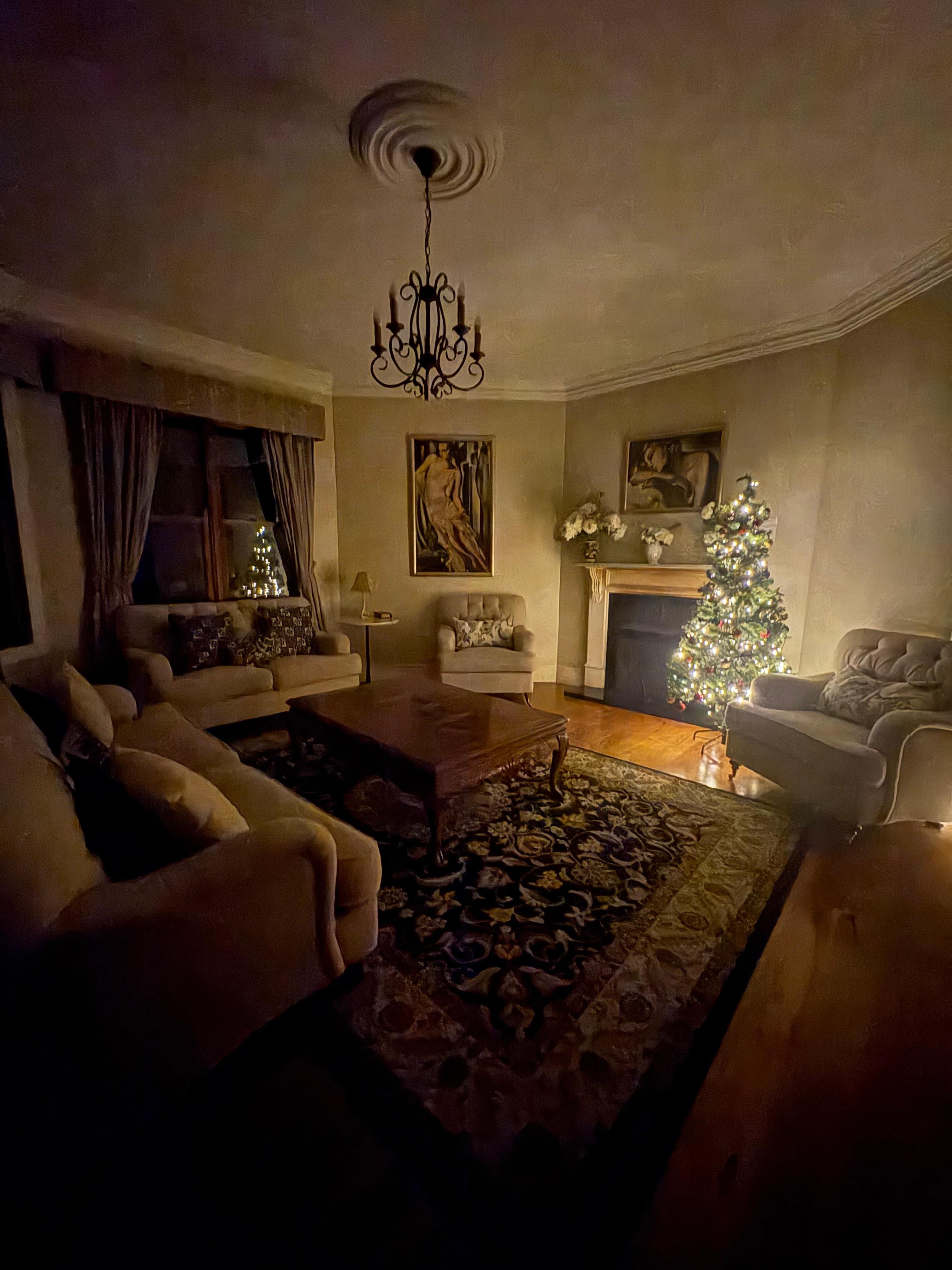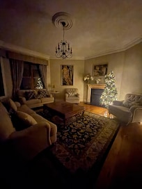 Auch im Winter besticht diese Unterkunft durch einen Kamin und mehrere Wohnbereiche.