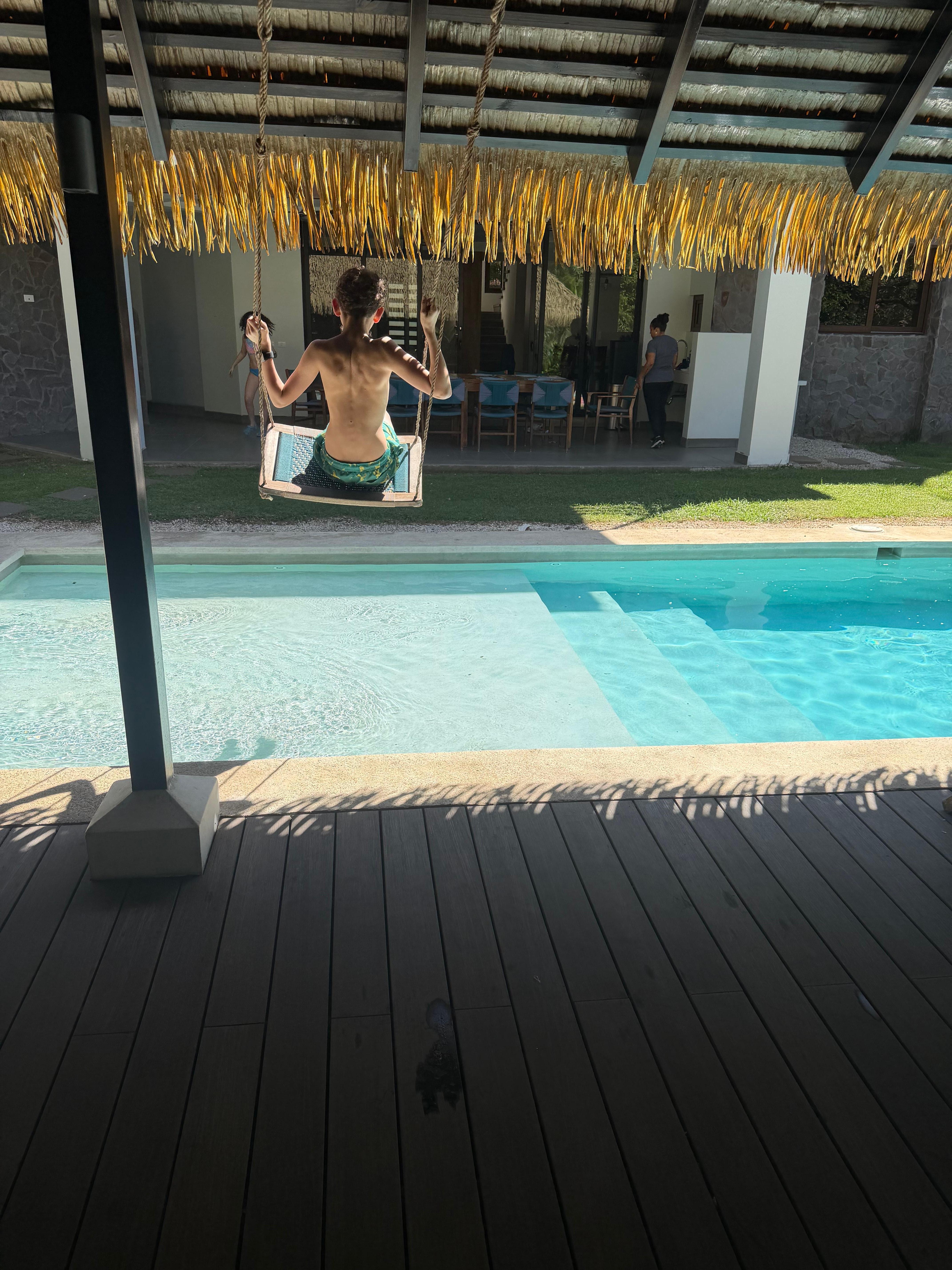 We stayed at Casa Hamacas With another family. There were 4 adults, two 13 year olds, and two 10 year olds. There was plenty of space for everyone. We loved the backyard the most. The kids LOVED the swings and after establishing some ground rules for them they had so much fun swinging. The covered area was everything we hoped it too be. We ate dinner out there several nights and grilled fresh caught mahi mahi. The only reason I couldn’t give it 6 stars is because there were some issues with the appliances in the kitchen. The dishwasher door is broken and you have to be very careful opening it or the bottom rack falls out. The stove top is a bit warm and the knobs are hard to use. And it appears there was a built in microwave that was replaced with a countertop one and the hole is covered with a white board. I’d say the kitchen could use some love and for the price per night, not what I would expect. But this did not deter us from enjoying the house and having a great time!
