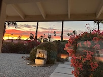 The view, the view, oh and did I mention... then there's the view from the living room. Lush bougainvillea hedges shelter the home from outside view and block the view of other homes while still allowing a spectacular sunrise, mountain, palm tree postcard experience every morning. Convenient. 5 minutes from everything: shopping, 16-screen movie theatre, the Dinah Shore Golf Tournament, the two largest consignment shops in the Valley, Palm Springs/Palm Desert.