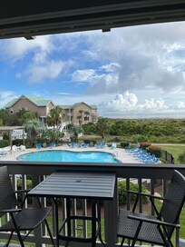 OUTDOOR LIVING: Furnished balcony with dining area, pool/ocean views