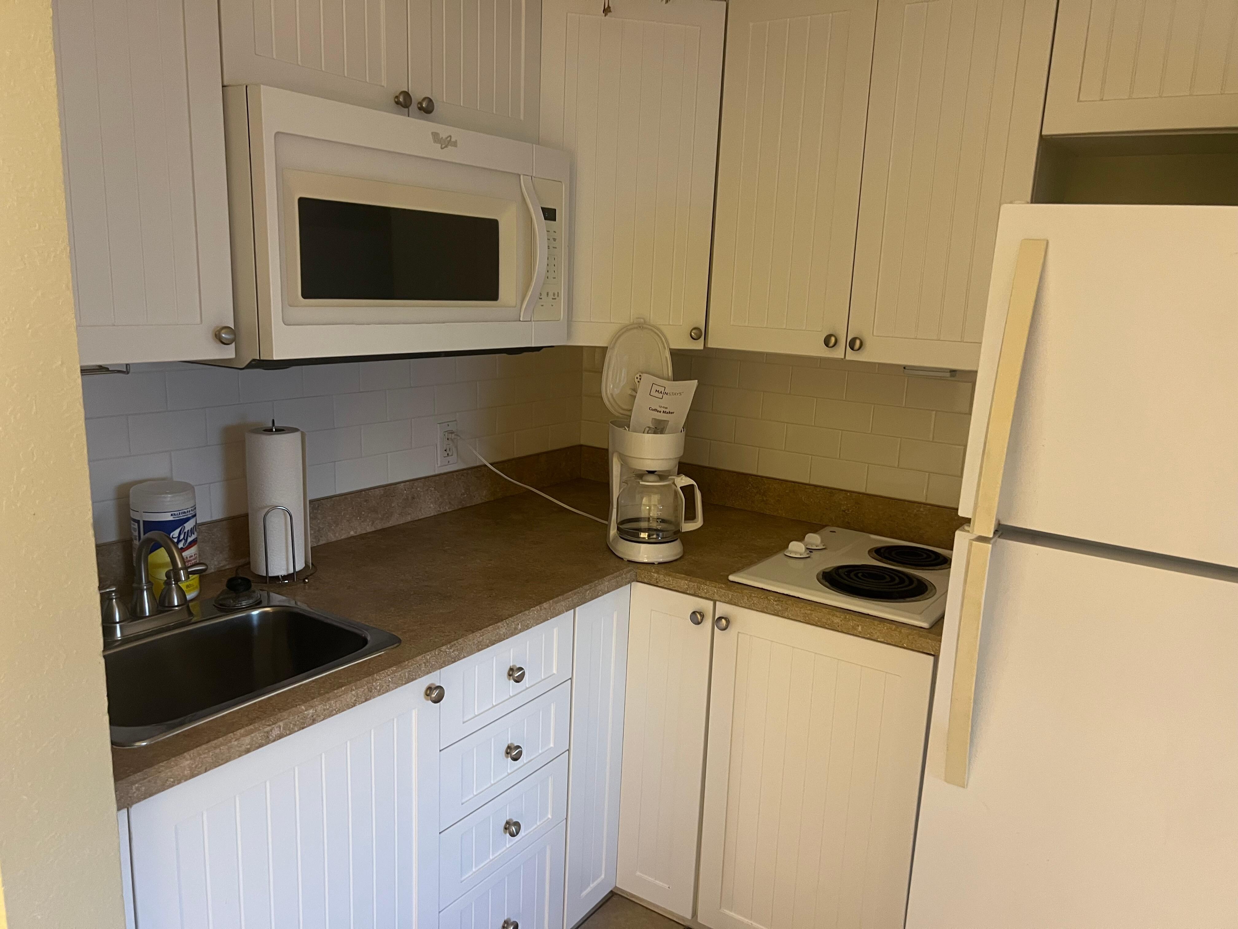 KITCHENETTE: Refrigerator, microwave, drip coffee maker, blender, stove