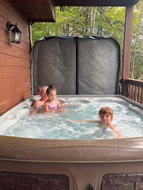 Sie müssen nicht im Whirlpool sein, um die Sehenswürdigkeiten und Geräusche der Smoky Mountains zu genießen. Die ����berdachte Veranda verfügt über einen Bistrotisch, an dem Sie Ihre erste Tasse Kaffee genießen können, während Sie den Sonnenaufgang beobachten (vorausgesetzt, Sie können sich so früh von diesem prächtigen Kingsize-Bett lösen!). Es gibt auch Rocker auf der Veranda und eines der beiden Decks hat sogar eine Veranda-Schaukel. Sie müssen sich mit den Kindern messen, um diesen Sitzplatz beanspruchen zu können!