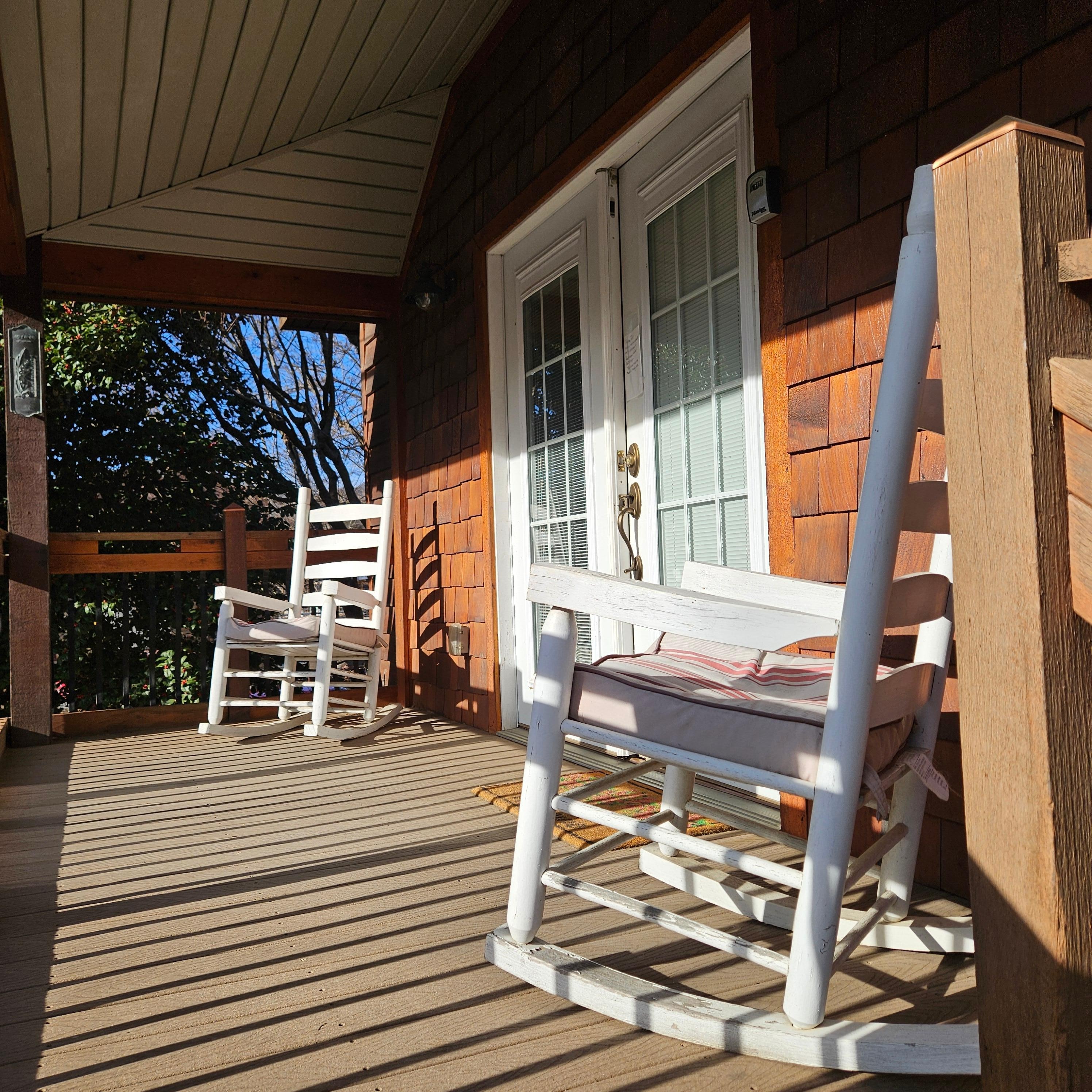 OUTDOOR LIVING: Covered deck, dining table, covered porch, rocking chairs, covered patio