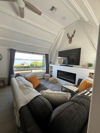 INDOOR LIVING: 3 Smart TVs w/ Netflix, modern furnishings, dining nook, Bluetooth speakers, interior Puget Sound views