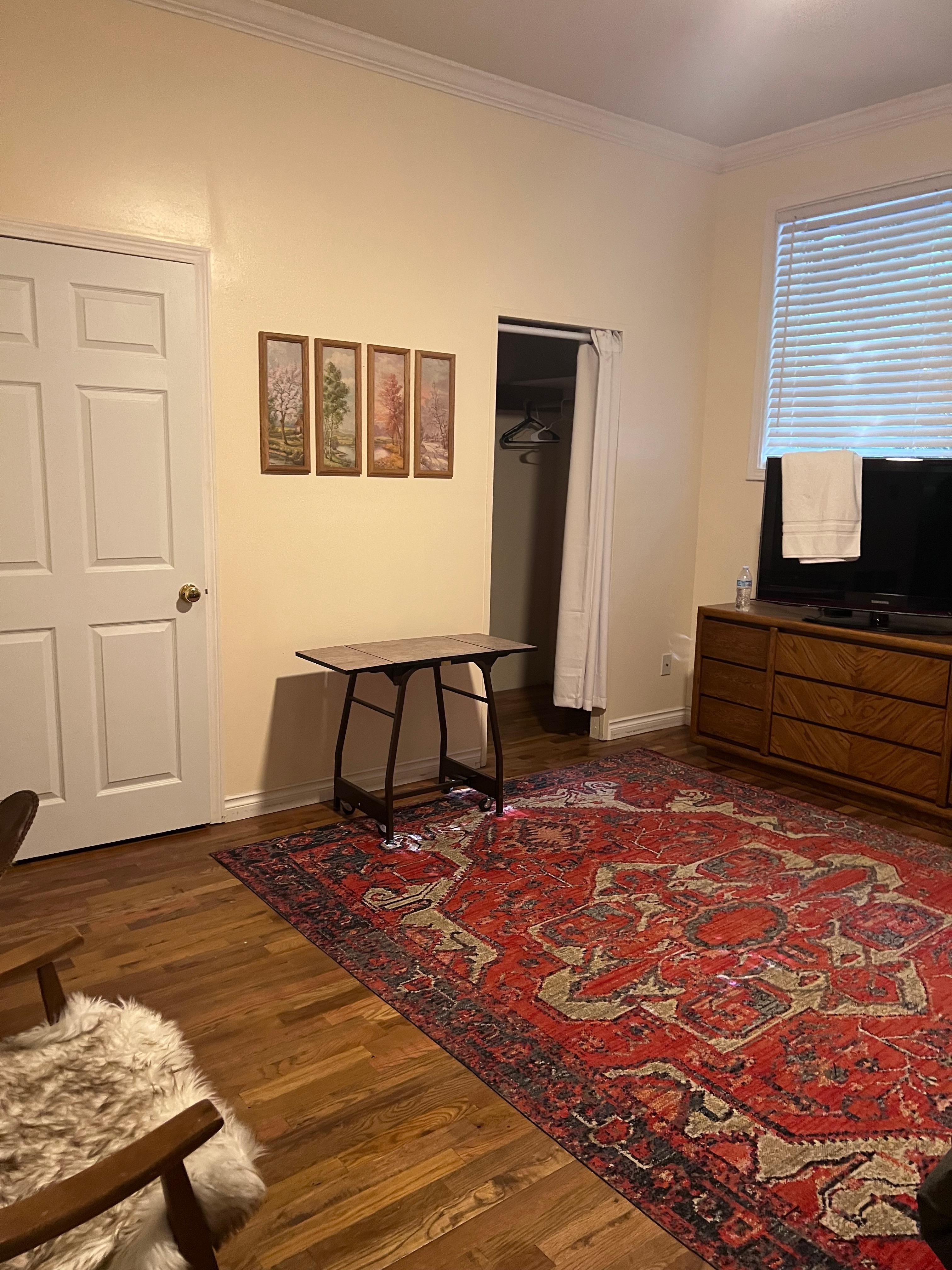 The first bedroom includes a king bed and 1/2 bath. The second bedroom has a queen bed with a full shower and rain shower head just across the hall. The new front-loading washer and dryer are in a closet in the large bathroom. The open floor plan and spacious rooms create plenty of room for 4 guests and your dog. Your mature dog over 1 year old is welcome to join you for an additional charge.