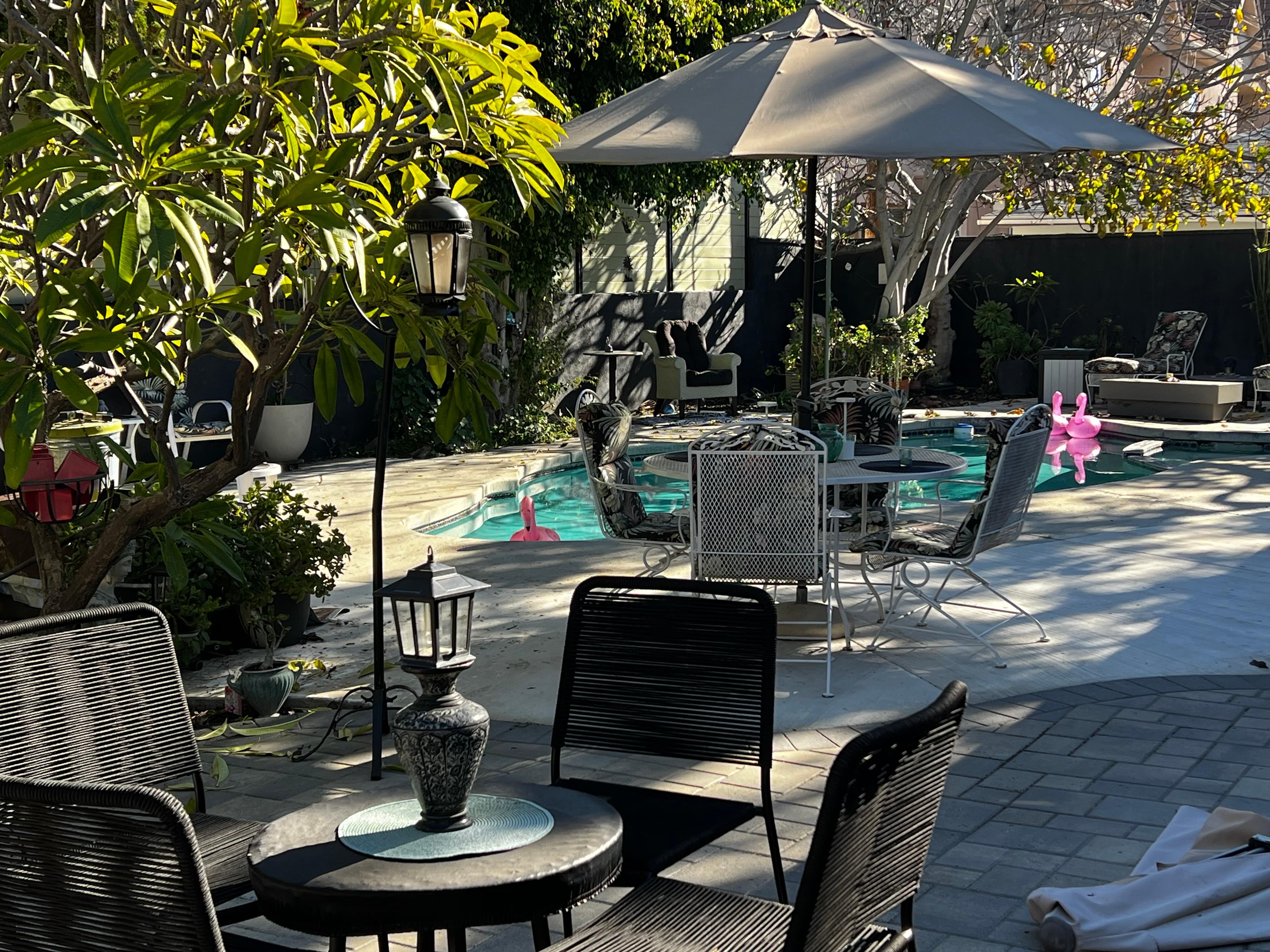 Der Außenpool und der Whirlpool befinden sich in diesem hinteren Gartenbereich. Für unsere jüngsten Gäste kann ein 5 ft. Sicherheitstor verwendet werden, das den Pool und das Spa umgibt. Es gibt keine Einschränkungen für die Nutzung der Immobilie, des Pools oder des Wellnessbereichs. AUSSERDEM, kommerzielle oder private Filmaufnahmen jeglicher Art verstoßen gegen die Mietbedingungen. Kündigung sofort. Wenn Sie mehr als einen Hund mitbringen, müssen die Besitzer informiert werden und es wird eine Gebühr erhoben.