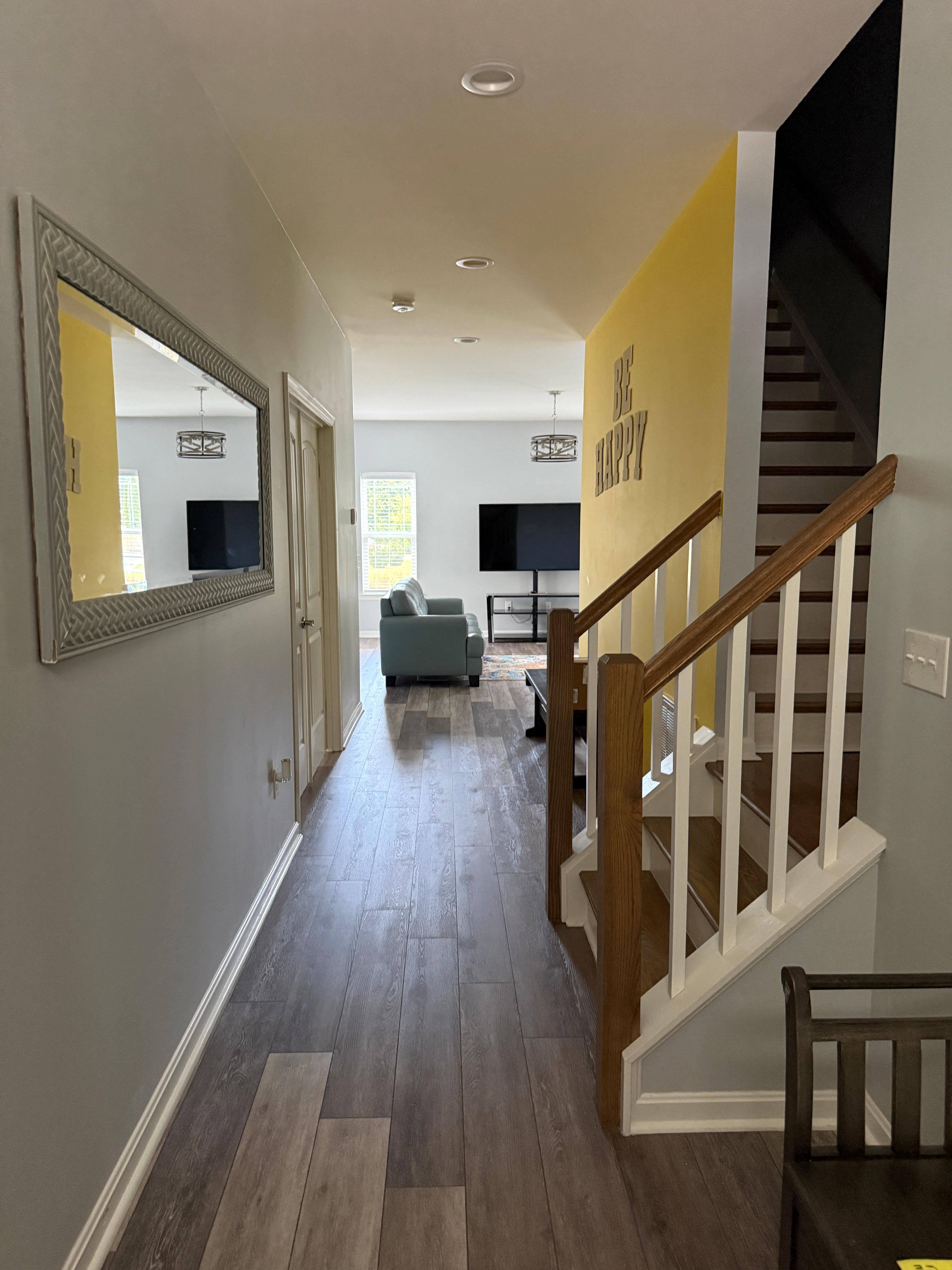 FAQ: Stairs required to enter, bedroom & bathroom on 1st floor, 2 external security cameras (facing out), towels not provided