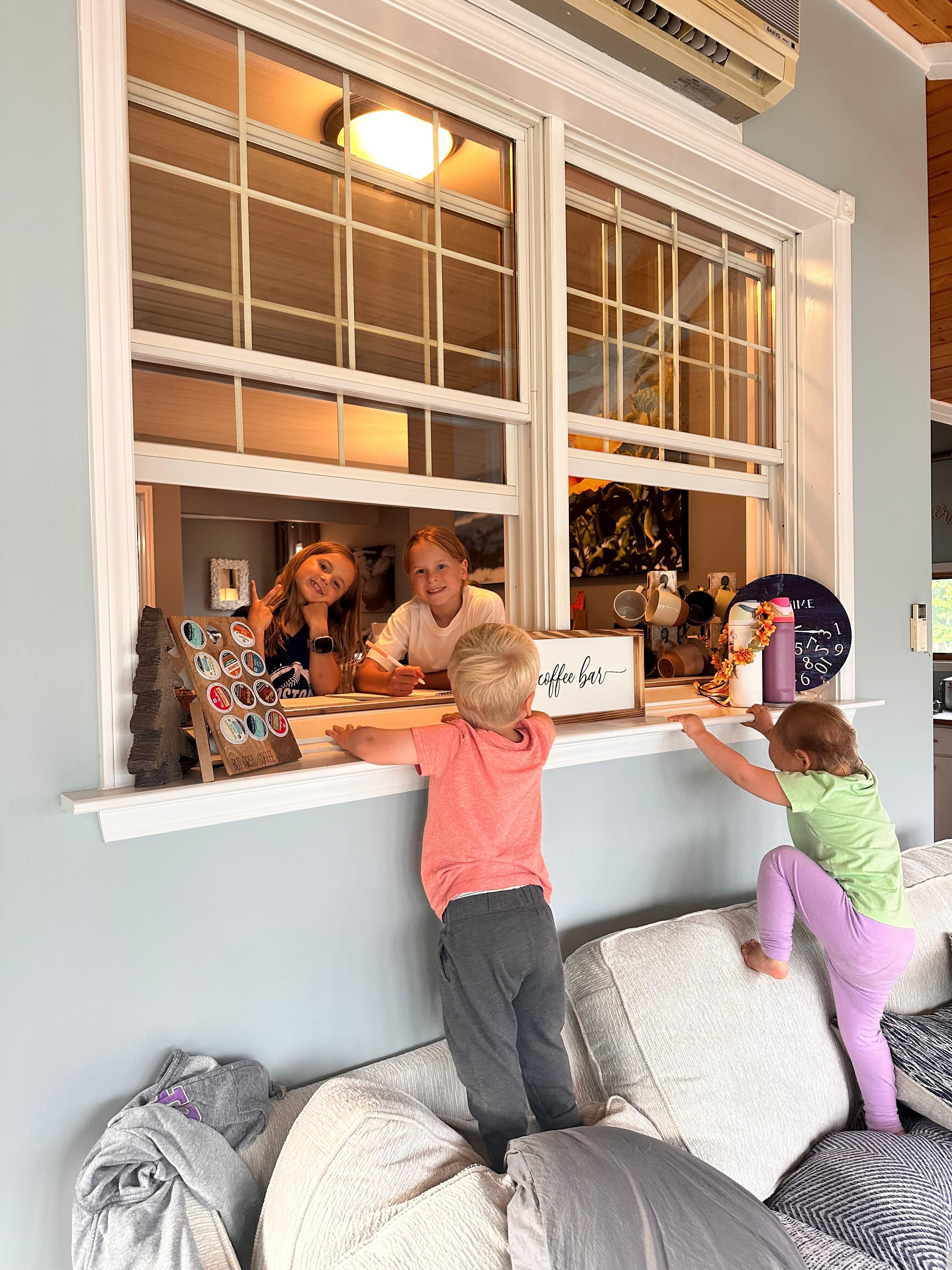 Infant-toddler items (pack n play, high chair, monitor) are located in the lower right-hand cabinet in the dining area.
