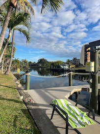 OUTDOOR LIVING: Lanai w/ heated pool (new, open year-round), pool toys, furnished patio, dining area, canal views, beach toys, coolers, fishing poles, kayaks, boat tie-ups